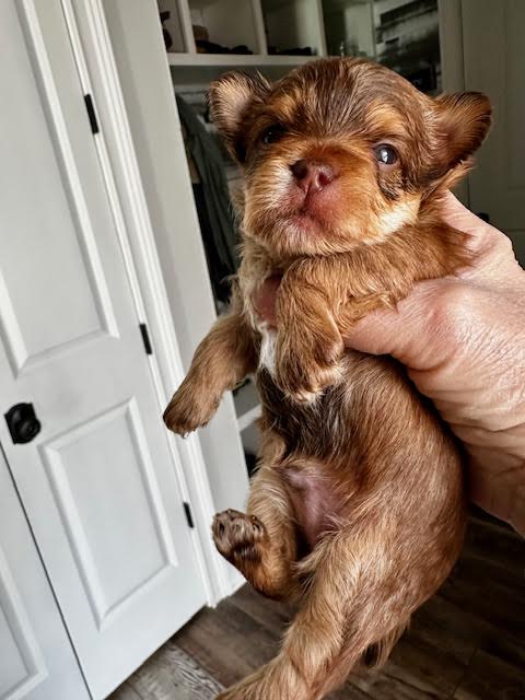 Sallie B is an AKC Chocolate Parti Yorkshire Terrier. She is as healthy and happy as she can be. She is so beautiful it makes your heart leap! Both of her parents are Parti Yorkies with white, chocolate and black coloring. Sallie is all things beginning with S - silly, sassy, strong, spunky and spectacular!