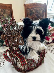 We hope Sallie Belle will have her 1st litter sometime in 2026.  Sallie is an AKC registered Parti Yorkie with tons of personality and cuteness!